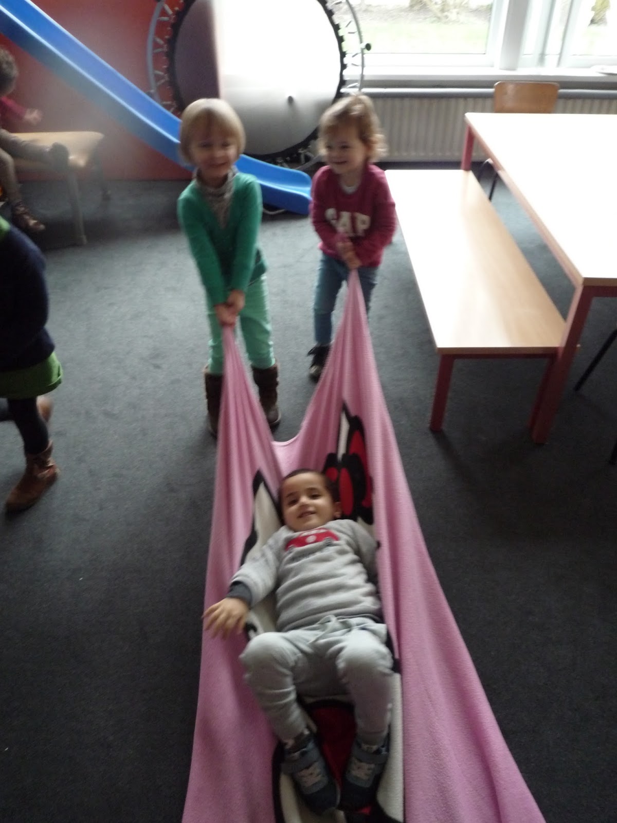 Jules hielp zijn papa heel flink in het verhaaltje dat juf ons vertelde. Zijn papa was uitgegleden op het ijs en had pijn aan zijn enkel. Papa mocht op de slee zitten en Jules trok de slee tot aan hun huis.